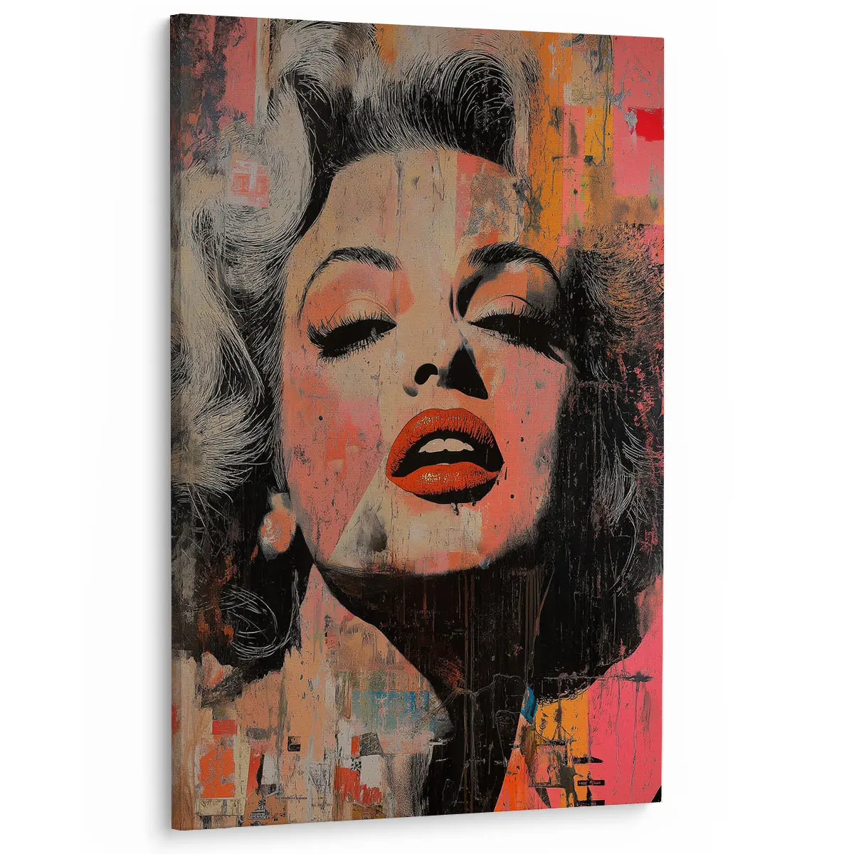 Een expressieve street art interpretatie van een Marilyn Monroe portret met opvallende rode lippen en verweerde texturen. De warme oranje en roze tinten gecombineerd met de ruwe, artistieke afwerking creëren een krachtig en emotioneel kunstwerk. Deze print brengt een vleugje urbane kunst en moderne expressie in huis, ideaal voor een eigentijds of industrieel interieur.