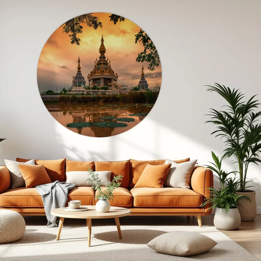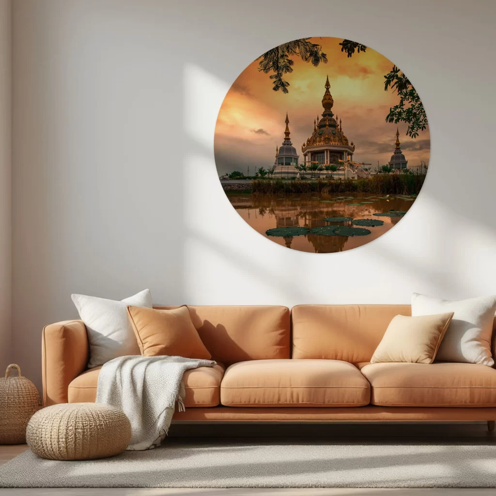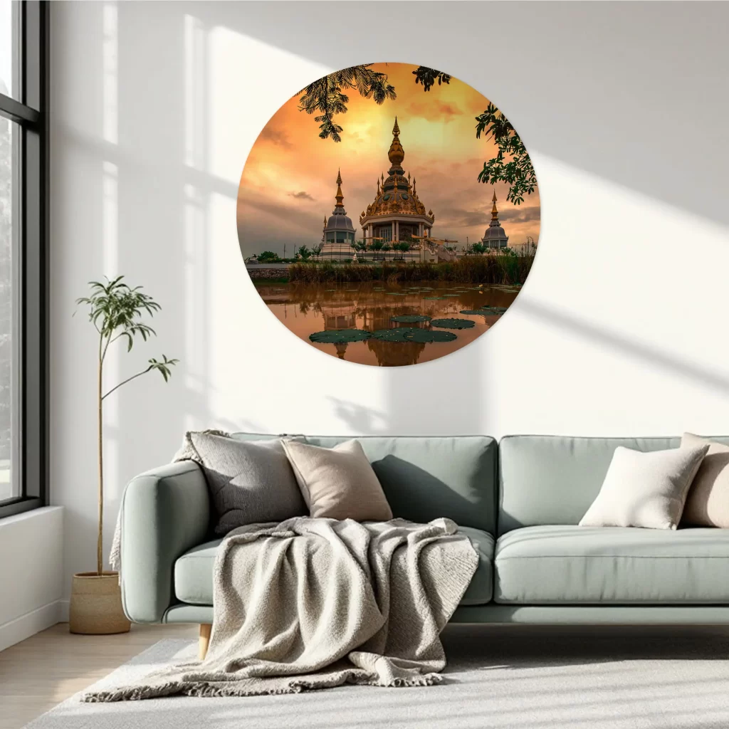 Een betoverende zonsondergang over een prachtige Thaise tempel, weerspiegeld in het water met lotusbladeren. De warme oranje en gouden tinten van de lucht contrasteren prachtig met de sierlijke architectuur en groene accenten. Deze print brengt een exotische, spirituele sfeer in elk interieur en vormt een indrukwekkend focal point in een werelds of oosters geïnspireerde ruimte.