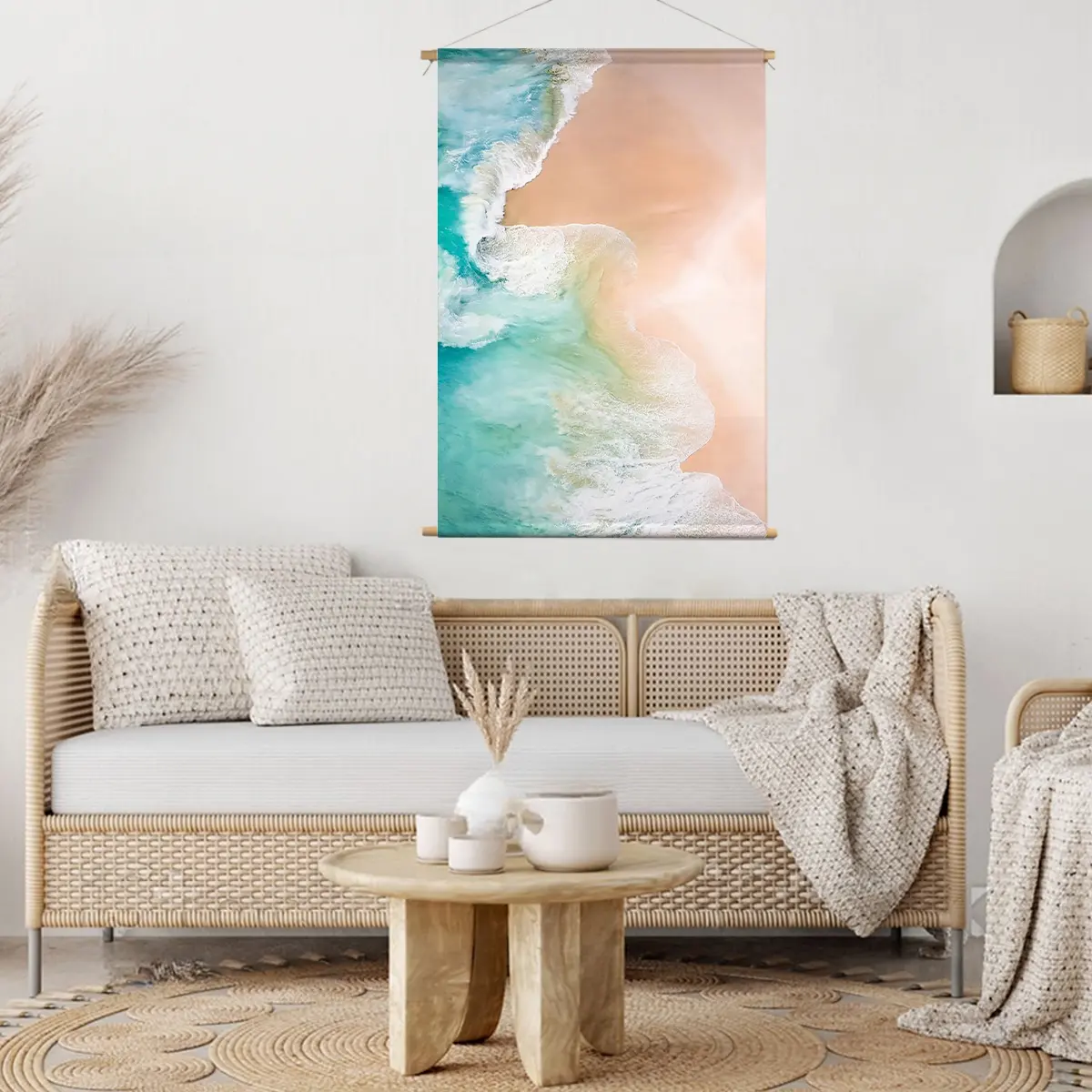 Een spectaculaire luchtfoto waar turquoise oceaanwater het zandstrand ontmoet in een natuurlijk kunstwerk. De levendige contrasten tussen het heldere water en het zachte zand creëren een tropische sfeer die direct vakantiegevoel oproept. Deze print voegt een vleugje luxe en zomerse frisheid toe aan elk interieur.