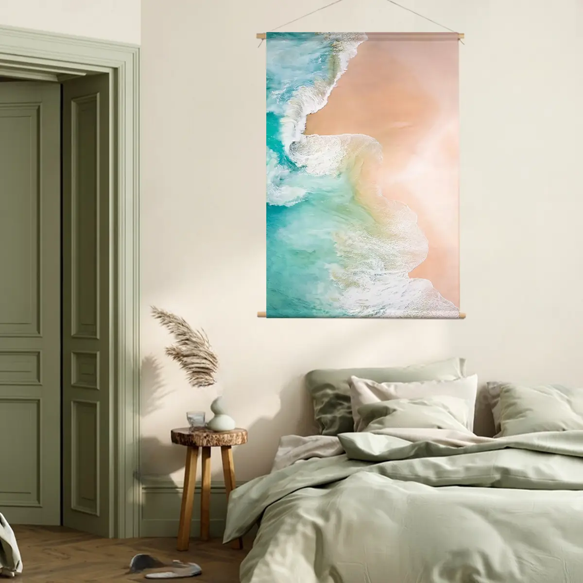 De textieldoek past perfect in onze nieuwe slaapkamer. Wat ik vooral fijn vind is dat het geen spiegeling geeft zoals bij normale posters achter glas.