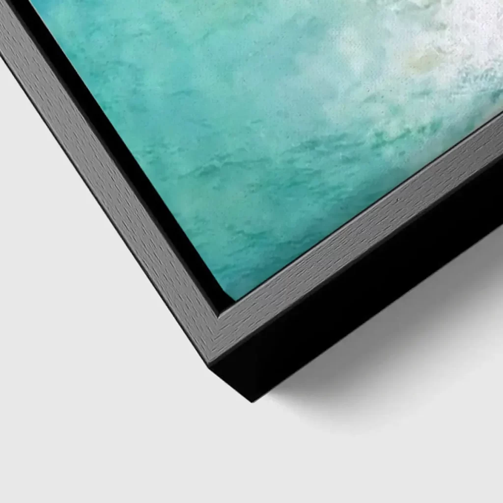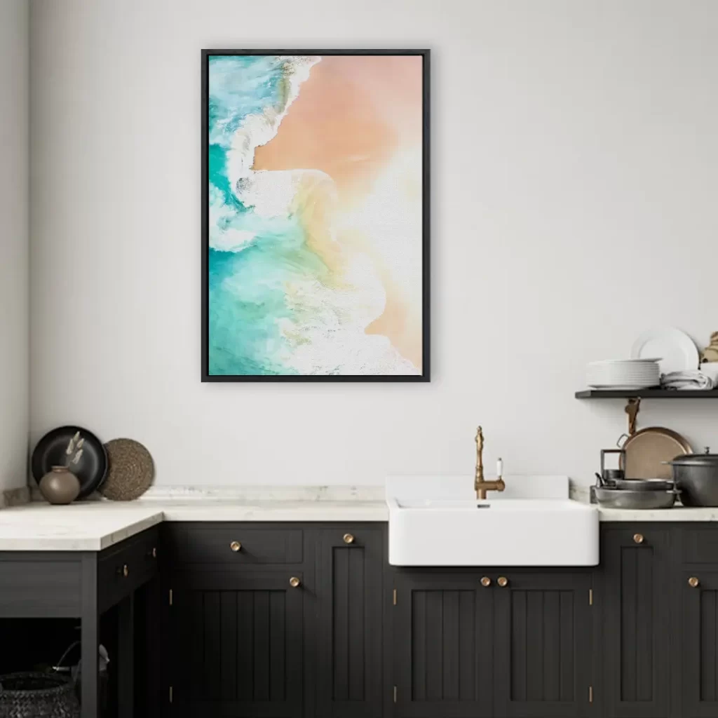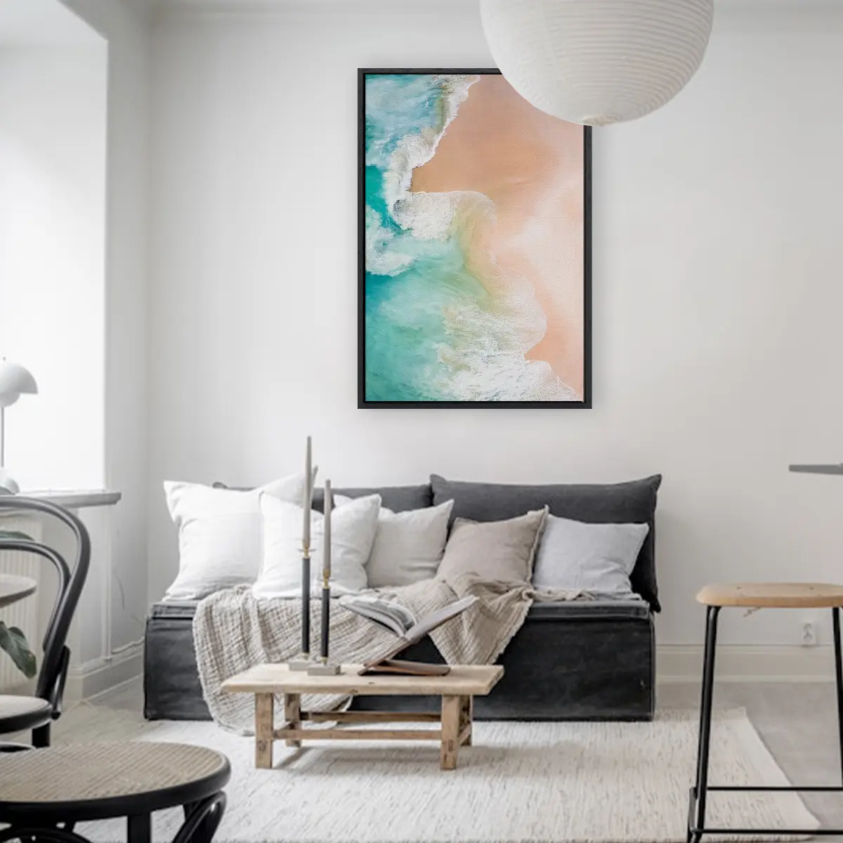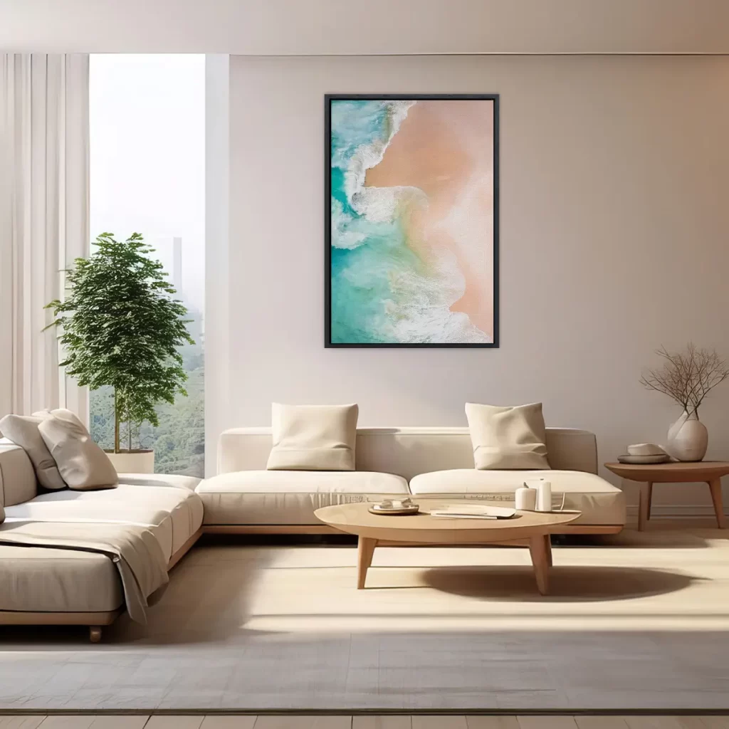 Een spectaculaire luchtfoto waar turquoise oceaanwater het zandstrand ontmoet in een natuurlijk kunstwerk. De levendige contrasten tussen het heldere water en het zachte zand creëren een tropische sfeer die direct vakantiegevoel oproept. Deze print voegt een vleugje luxe en zomerse frisheid toe aan elk interieur.