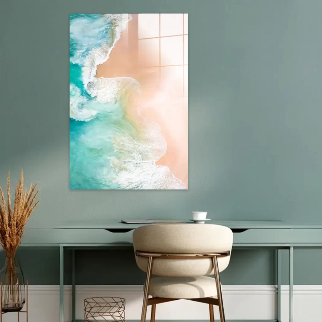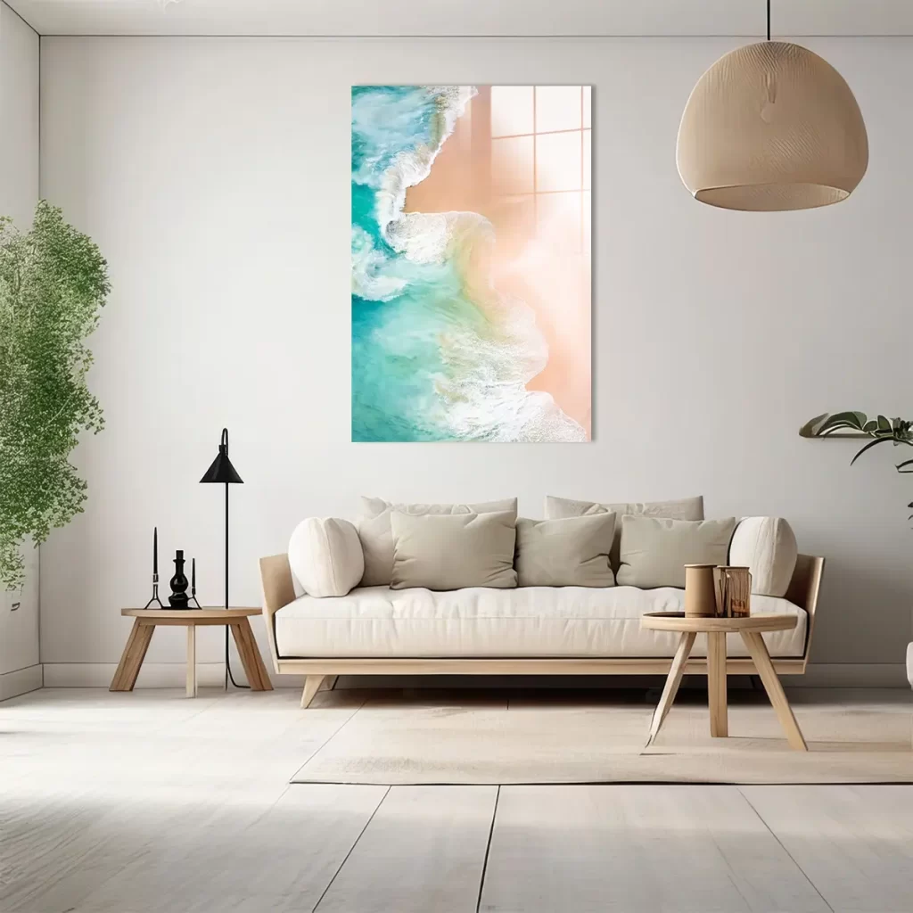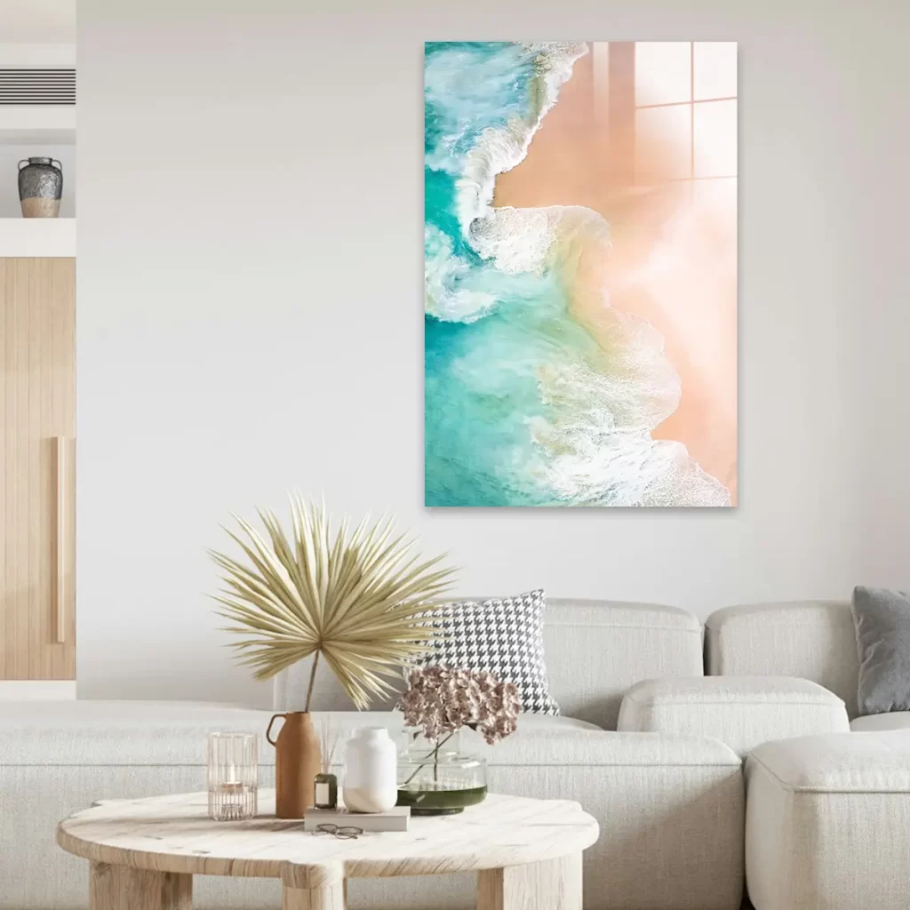 Een spectaculaire luchtfoto waar turquoise oceaanwater het zandstrand ontmoet in een natuurlijk kunstwerk. De levendige contrasten tussen het heldere water en het zachte zand creëren een tropische sfeer die direct vakantiegevoel oproept. Deze print voegt een vleugje luxe en zomerse frisheid toe aan elk interieur.