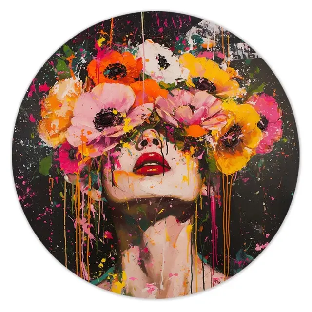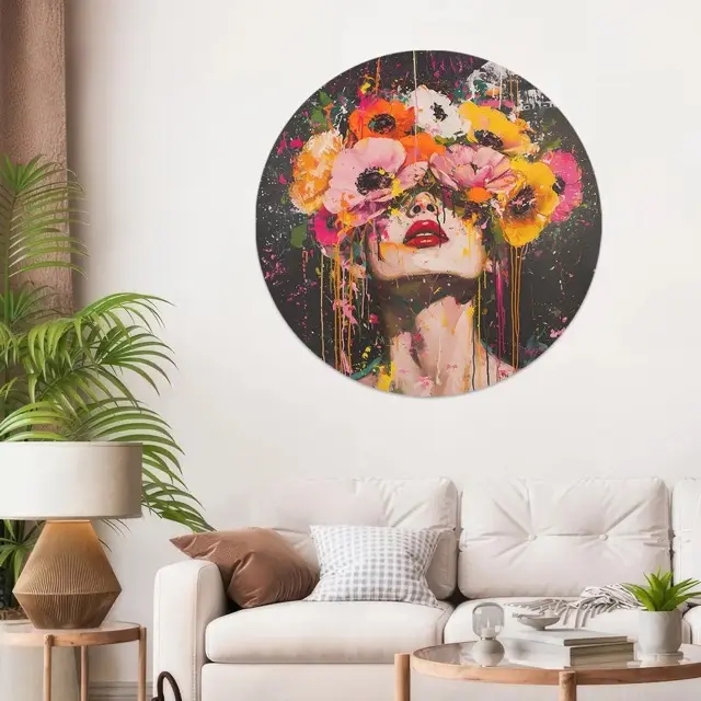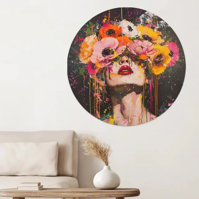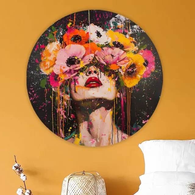 Deze print straalt een energieke en expressieve sfeer uit, door de felle kleuren en de combinatie van een menselijk portret met bloemen. Het werk roept een gevoel van vrijheid en creativiteit op, met de bloemen die de ogen bedekken en de abstracte verfspatten die een dynamisch effect creëren. Als wanddecoratie trekt het onmiddellijk de aandacht en geeft het een ruimte een levendige en artistieke uitstraling.