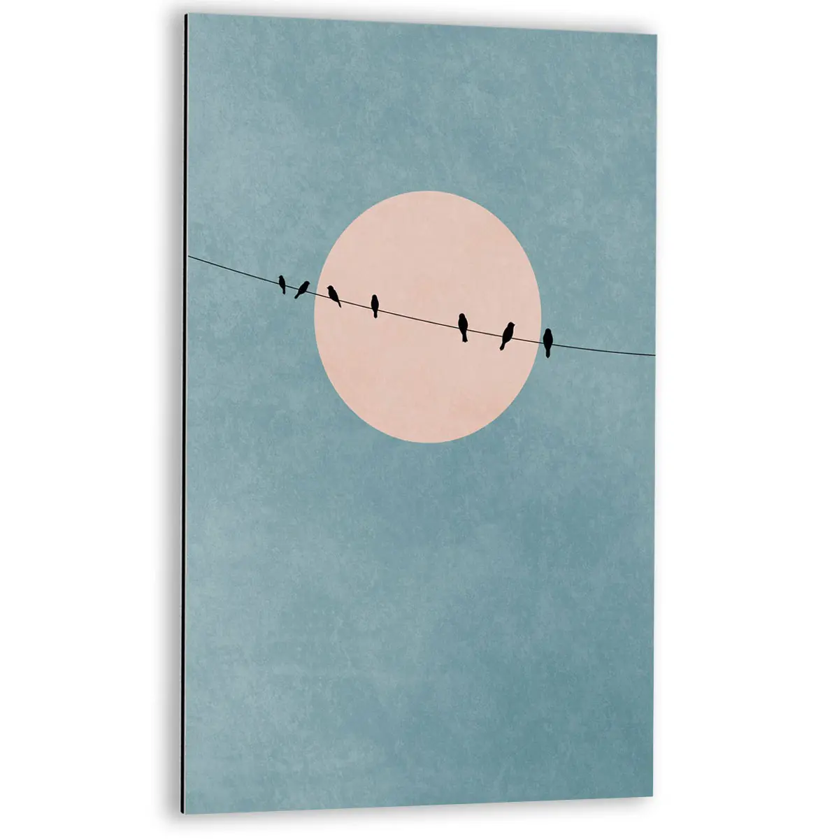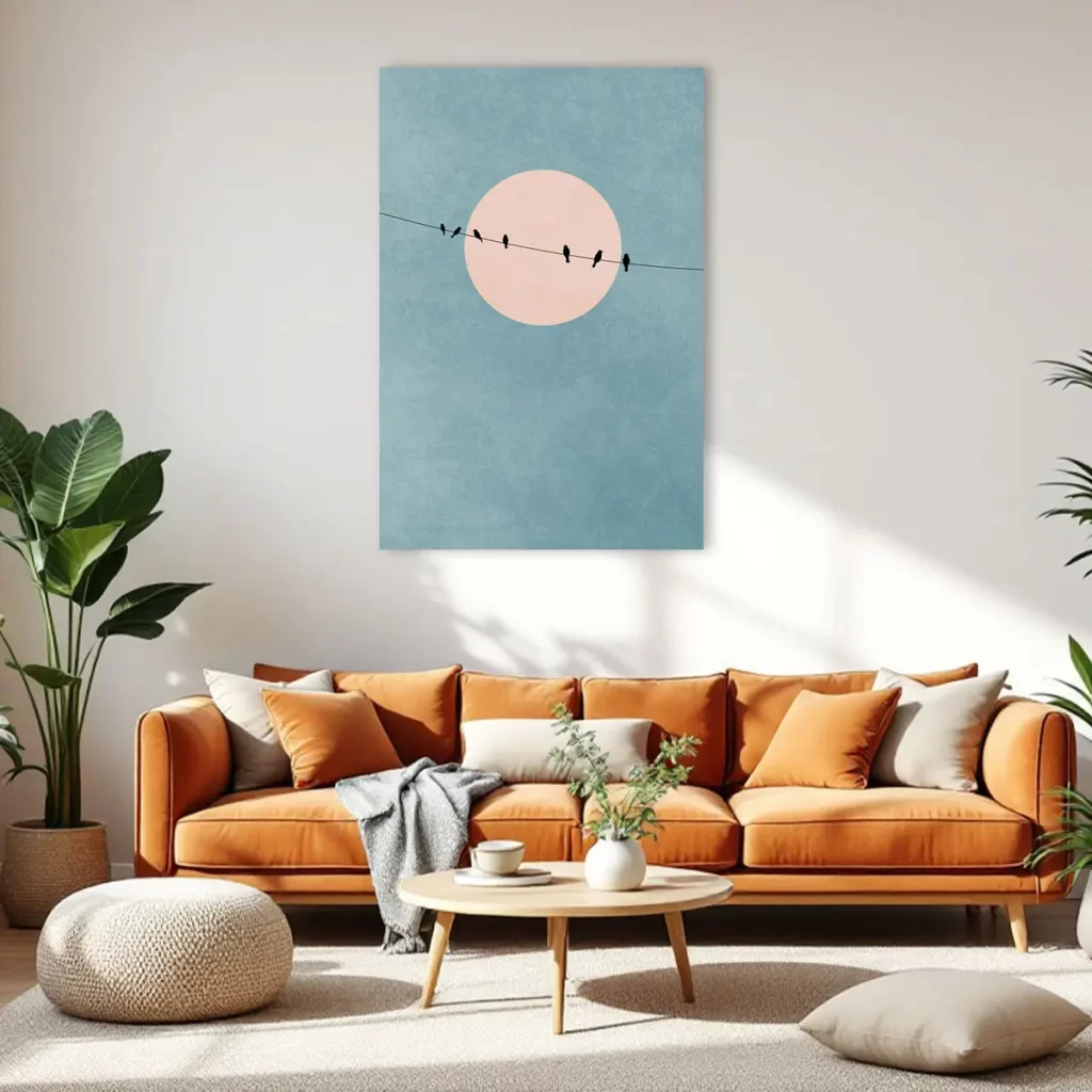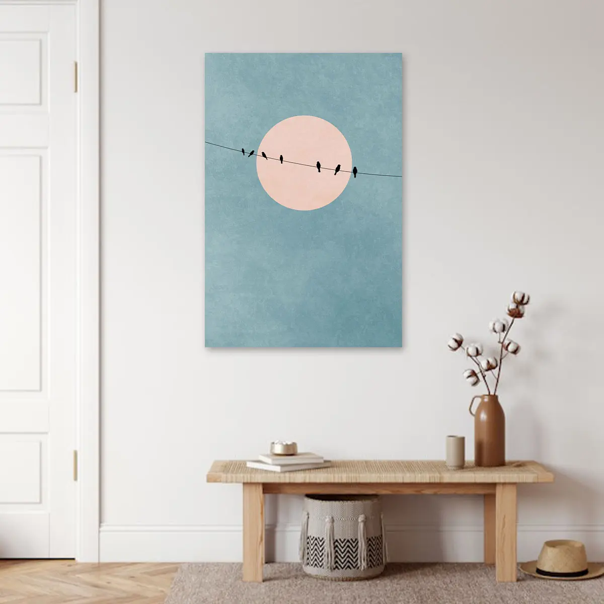 Een serene minimalistische compositie van vogels op takken tegen een zachte pastel zonsondergang. De grote roze zon en de subtiele kleurovergangen van turquoise naar roze creëren een dromerige, rustgevende sfeer. Deze print brengt een gevoel van rust en natuurlijke schoonheid in huis, perfect voor een moderne of Scandinavische inrichting.