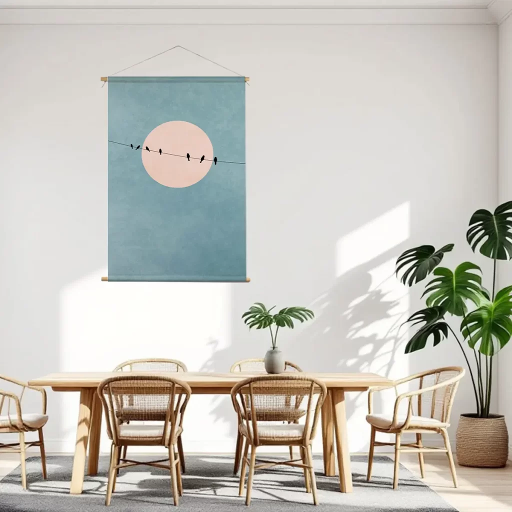Een serene minimalistische compositie van vogels op takken tegen een zachte pastel zonsondergang. De grote roze zon en de subtiele kleurovergangen van turquoise naar roze creëren een dromerige, rustgevende sfeer. Deze print brengt een gevoel van rust en natuurlijke schoonheid in huis, perfect voor een moderne of Scandinavische inrichting.