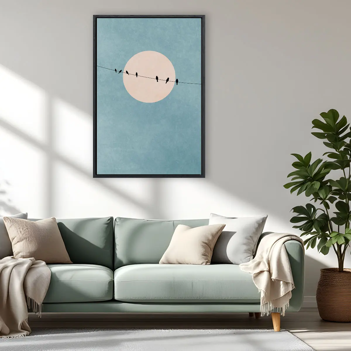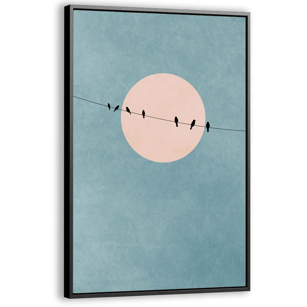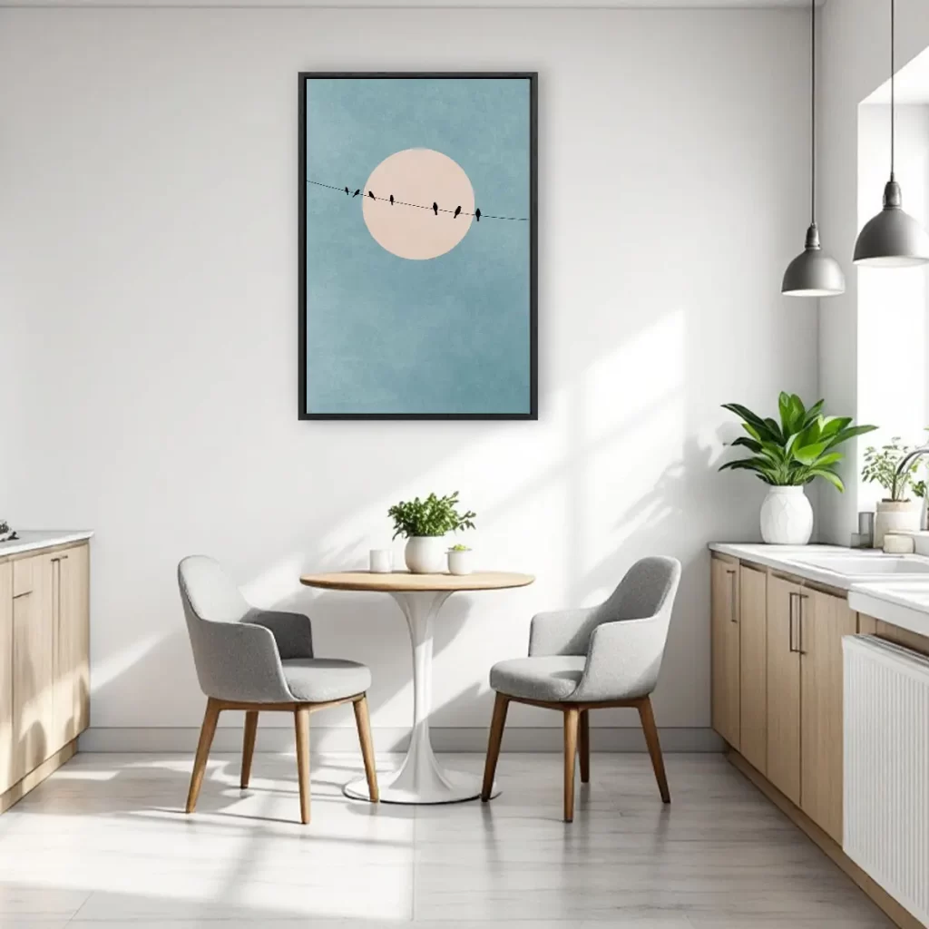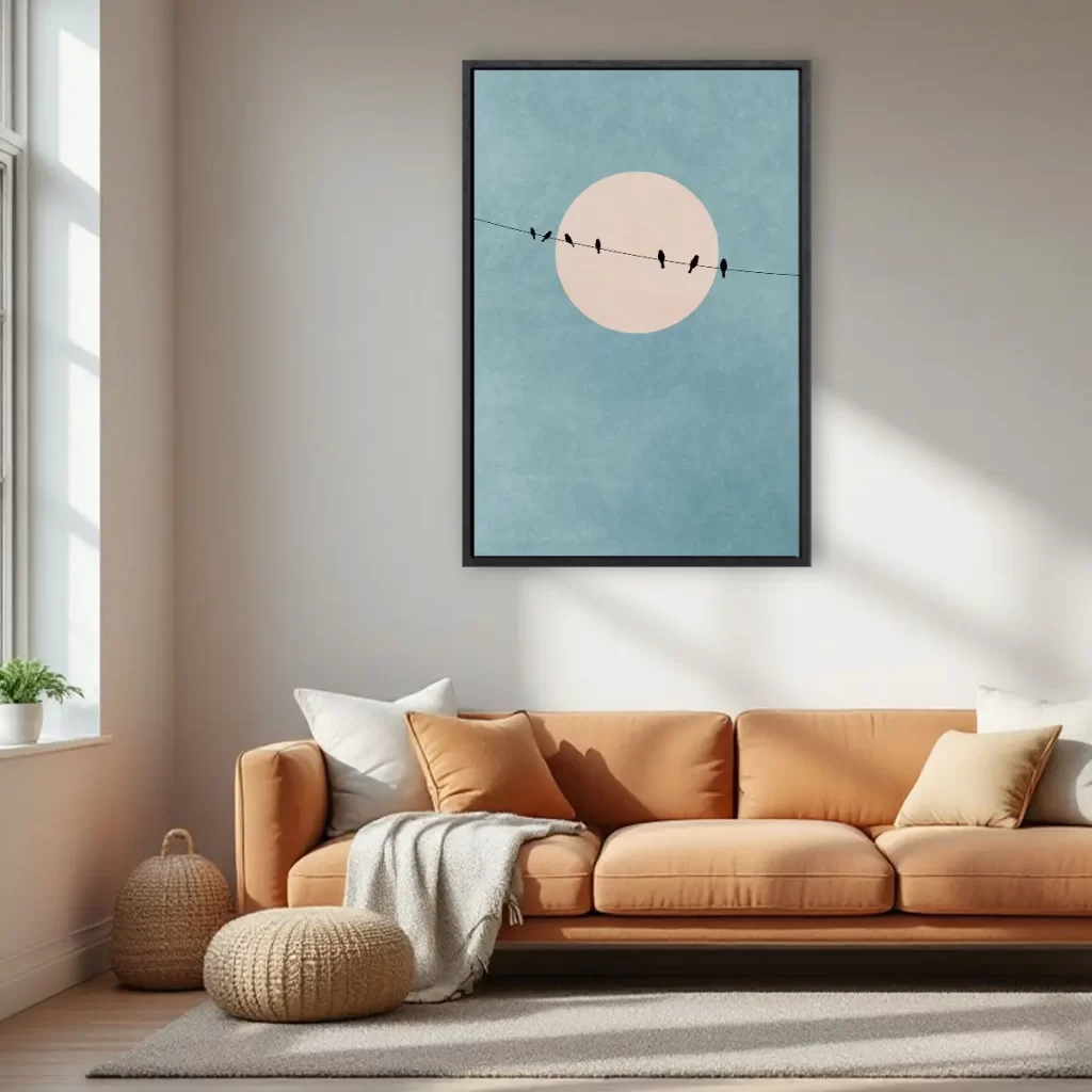 Een serene minimalistische compositie van vogels op takken tegen een zachte pastel zonsondergang. De grote roze zon en de subtiele kleurovergangen van turquoise naar roze creëren een dromerige, rustgevende sfeer. Deze print brengt een gevoel van rust en natuurlijke schoonheid in huis, perfect voor een moderne of Scandinavische inrichting.