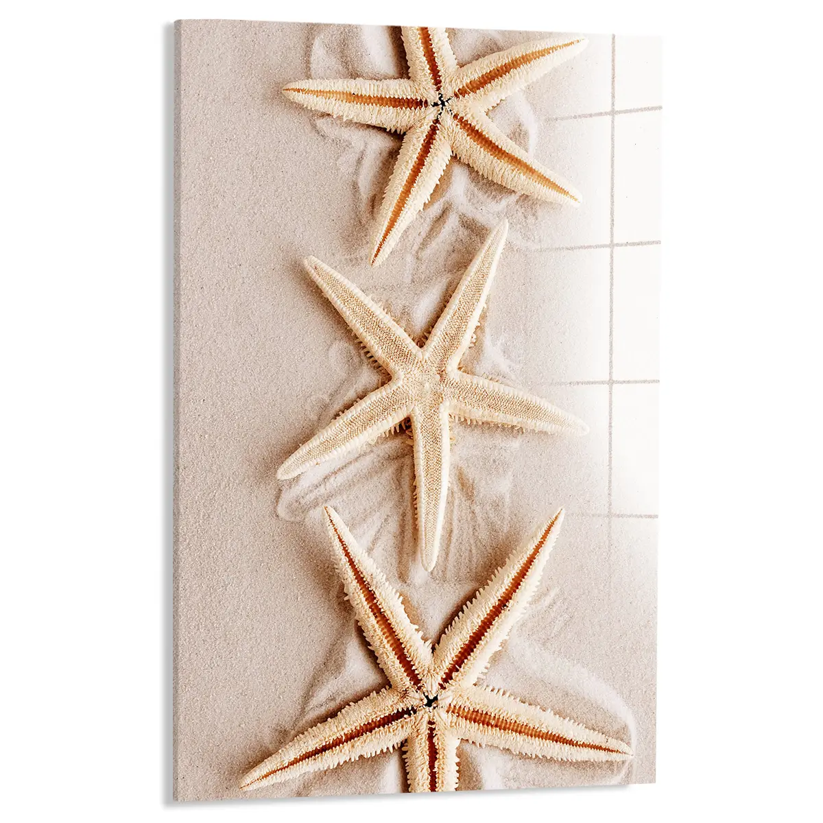 Een rustgevende close-up van delicate zeesterren rustend op fijn, zacht zand. De warme, neutrale tinten en de natuurlijke texturen creëren een serene strandsfeer die direct een gevoel van ontspanning oproept. Als wanddecoratie brengt deze print een vleugje strand en zomer in huis, perfect voor een natuurlijk of kustgeïnspireerd interieur.