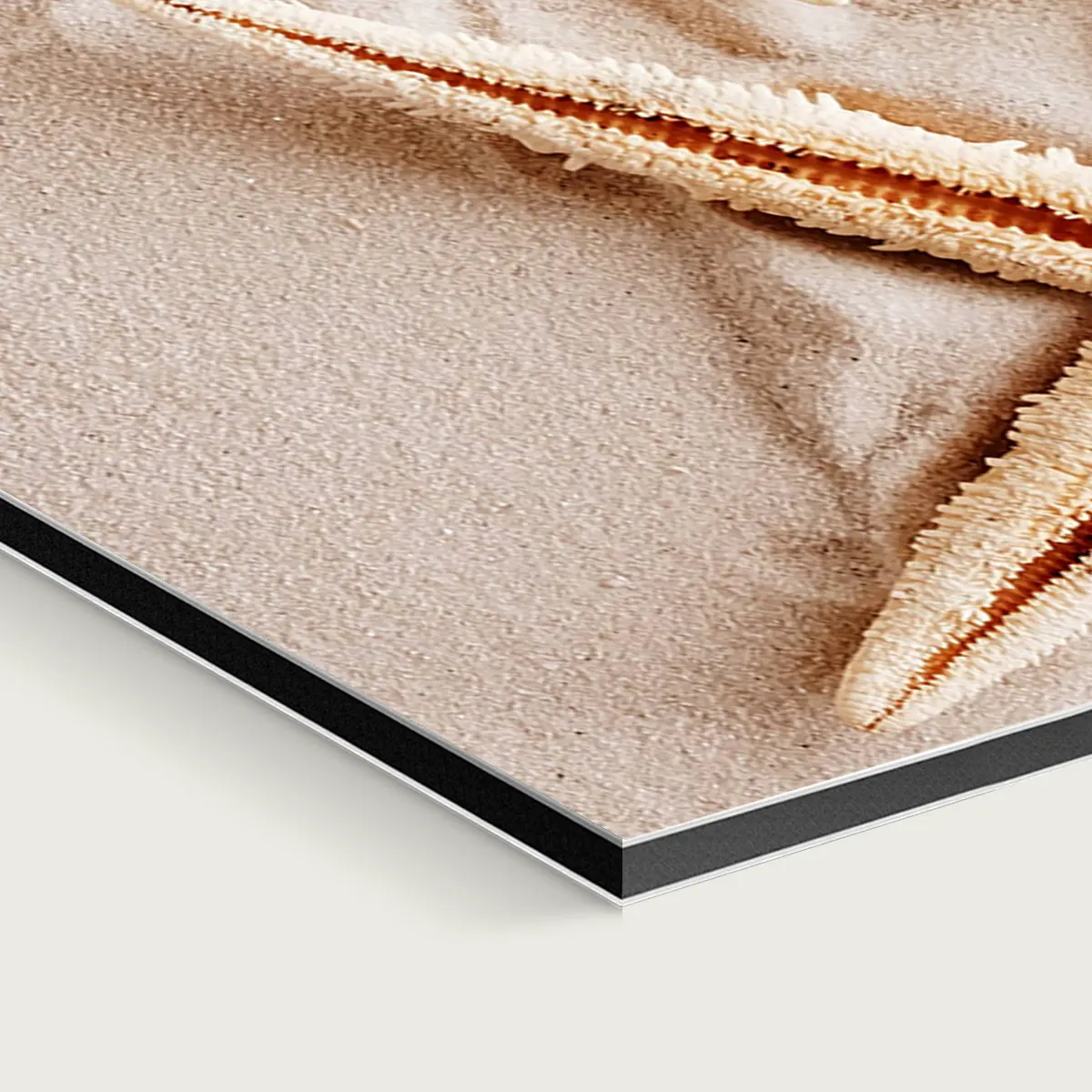 Een rustgevende close-up van delicate zeesterren rustend op fijn, zacht zand. De warme, neutrale tinten en de natuurlijke texturen creëren een serene strandsfeer die direct een gevoel van ontspanning oproept. Als wanddecoratie brengt deze print een vleugje strand en zomer in huis, perfect voor een natuurlijk of kustgeïnspireerd interieur.
